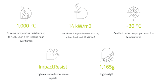 Dizayn: Dış katmanı yüksek parlama ve yanma noktası sağlayan metaaramid, çift yüzlü örgü Nomex®, silikon Kevlar® kaplama, Eurotex® nem bariyeri 5 parmaklı, 100% paraaramid iç astar, 50% Nomex, 50% Viskoz FR örgü bileklik.